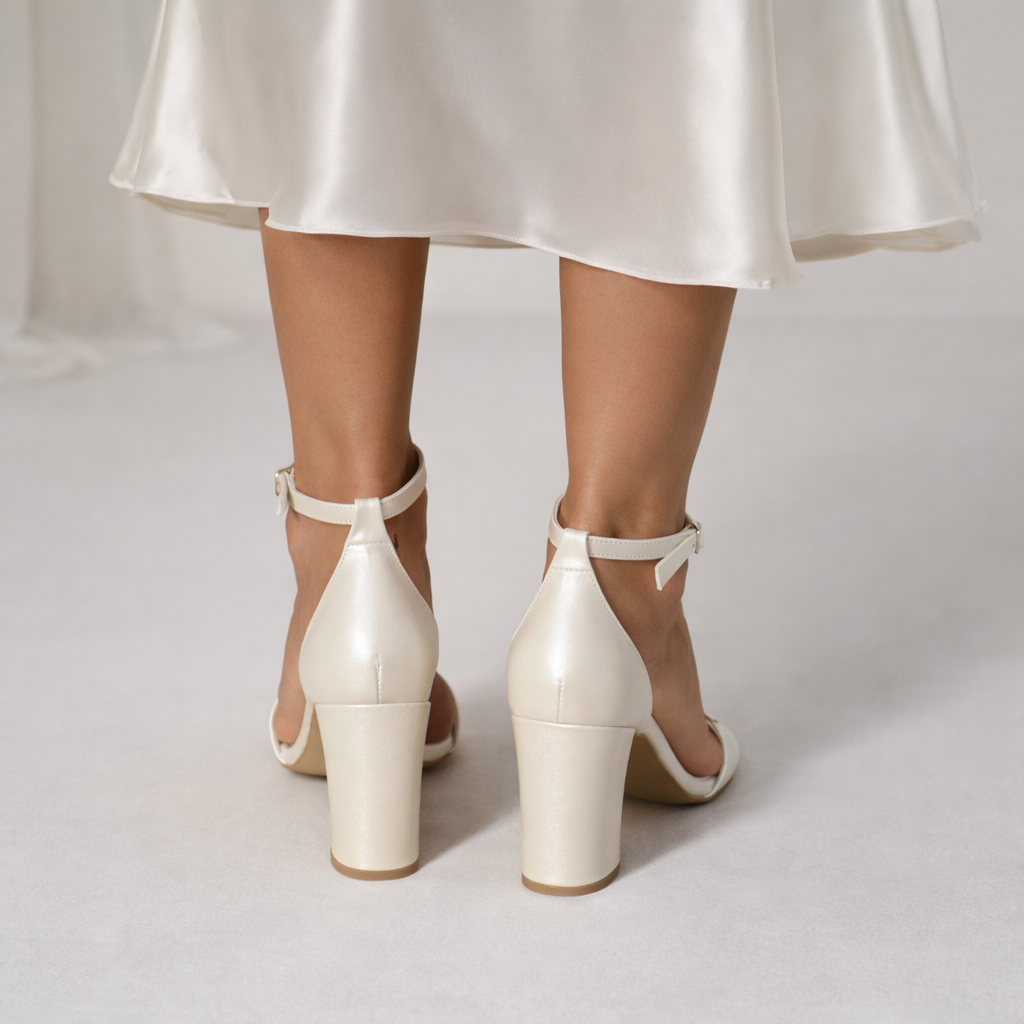 The perfect blend of classic and on-trend, our 'Eternity' sandals are handcrafted from premium pearly ivory leather, featuring a flattering ankle strap and finished with a chic block heel.