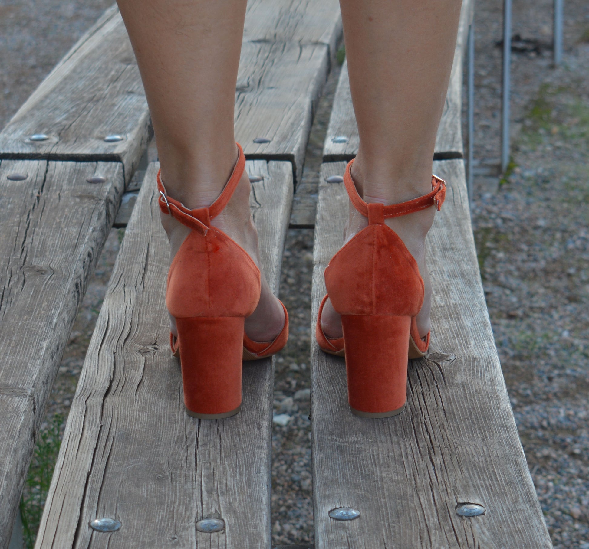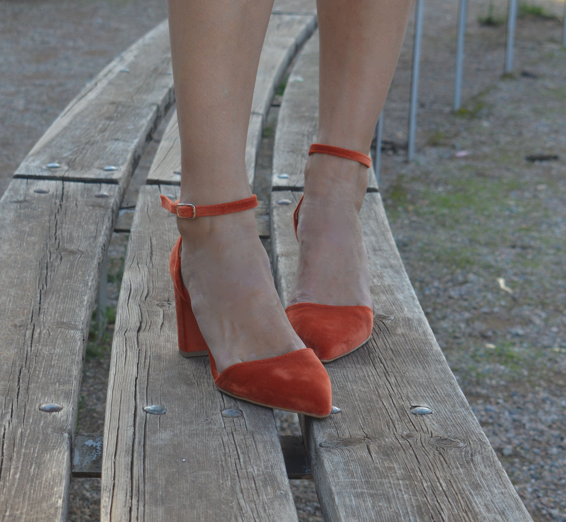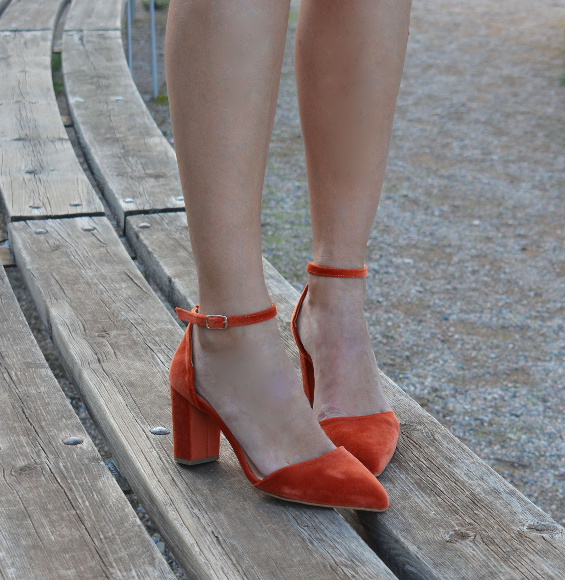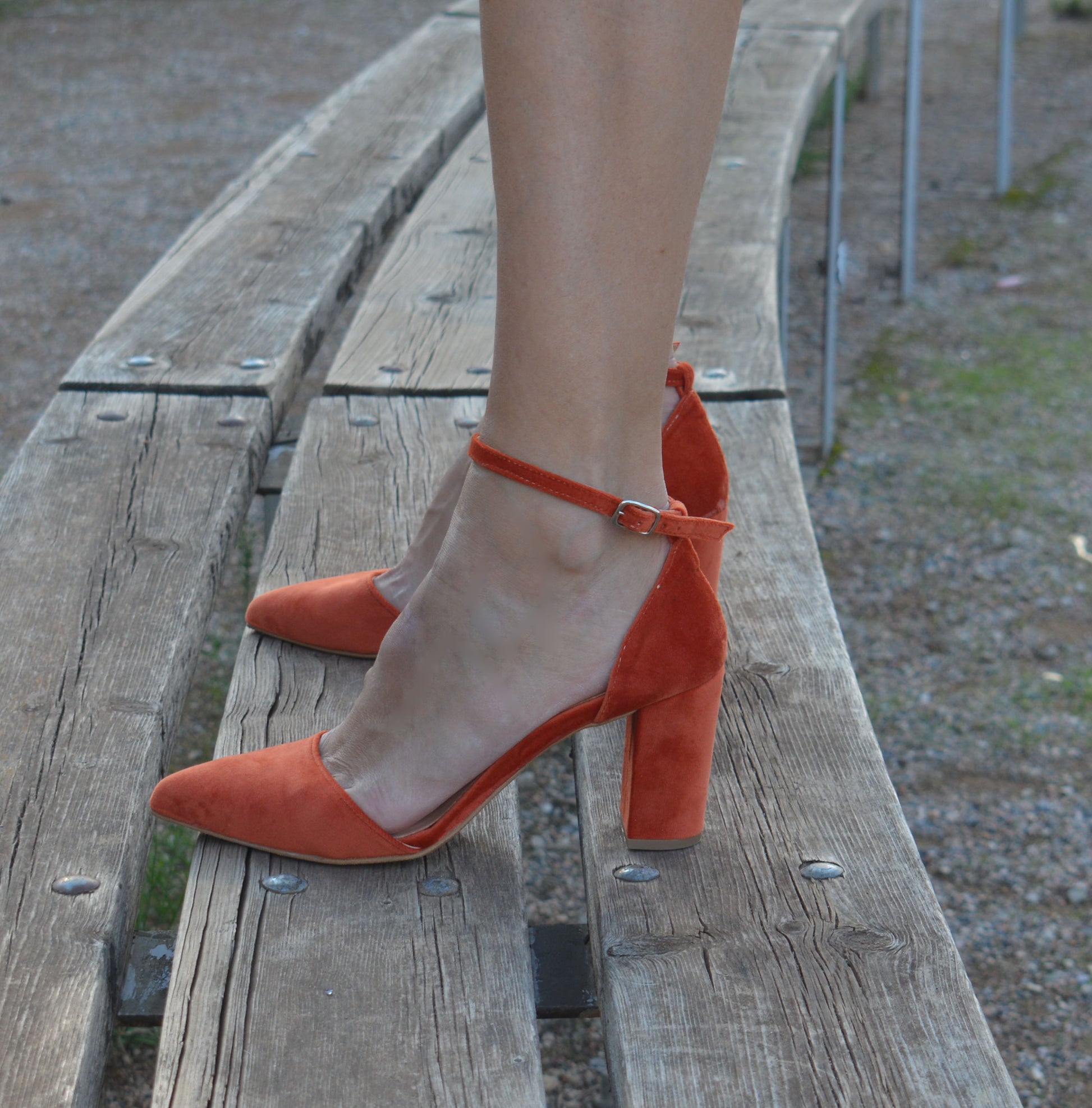 They are handcrafted by premium burned orange velvet and leather innersoles, featuring an ankle strap and are finished with chic and comfortable block heels. The ankle strap ensures secure fitting and the excellent craftsmanship ensures comfort for an all day wear.