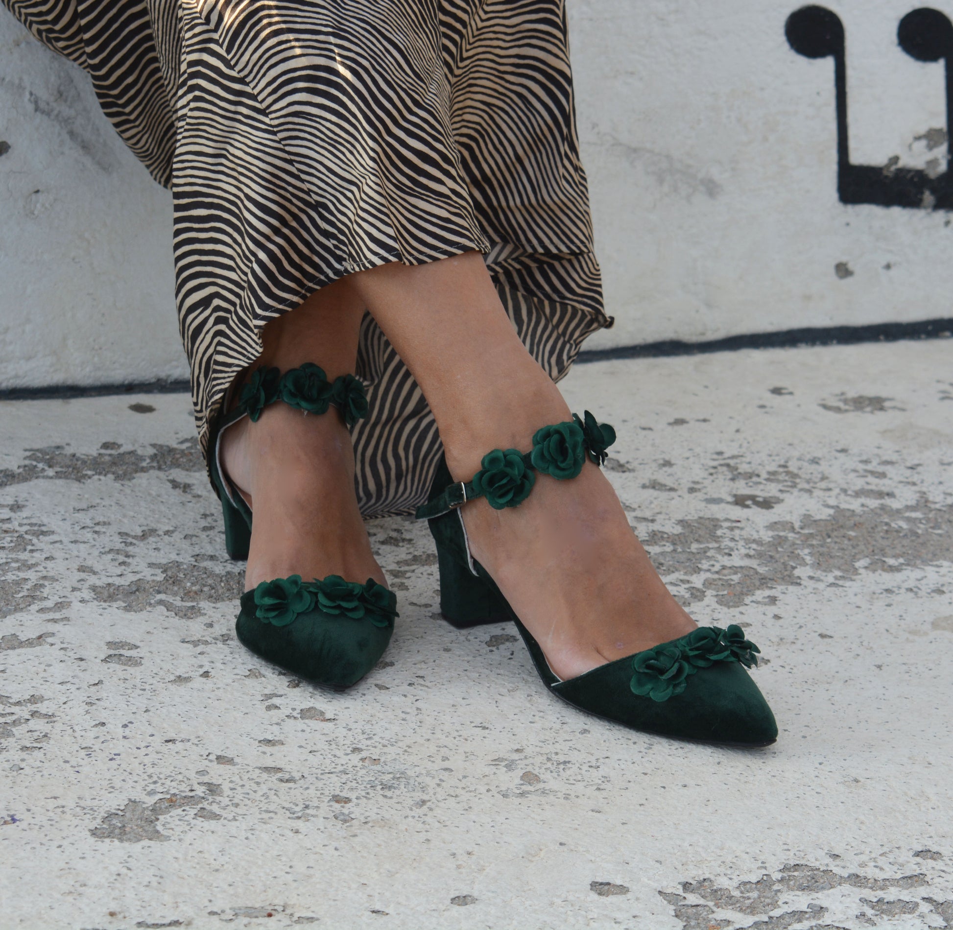 They are handcrafted by premium green velvet and leather innersoles, featuring an ankle strap and are finished with chic and comfortable block heels. The ankle strap ensures secure fitting and the excellent craftsmanship ensures comfort for an all day wear.
