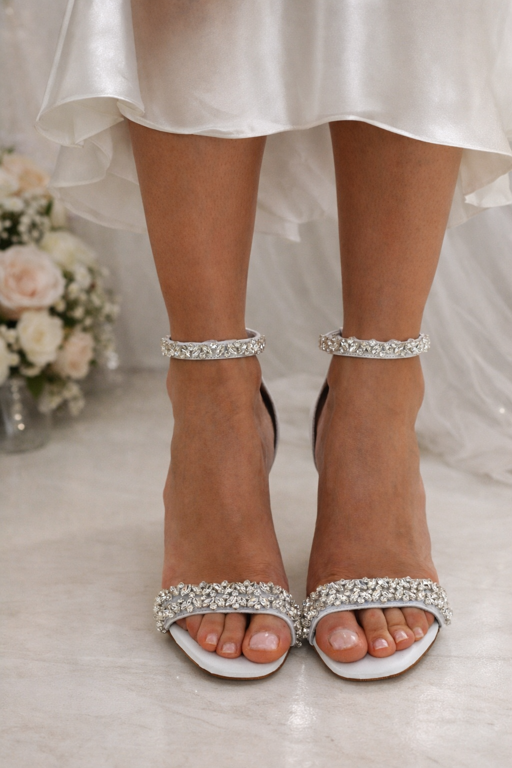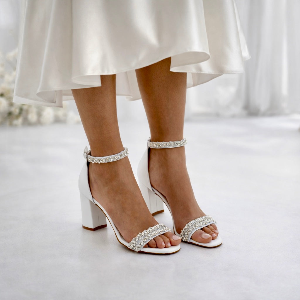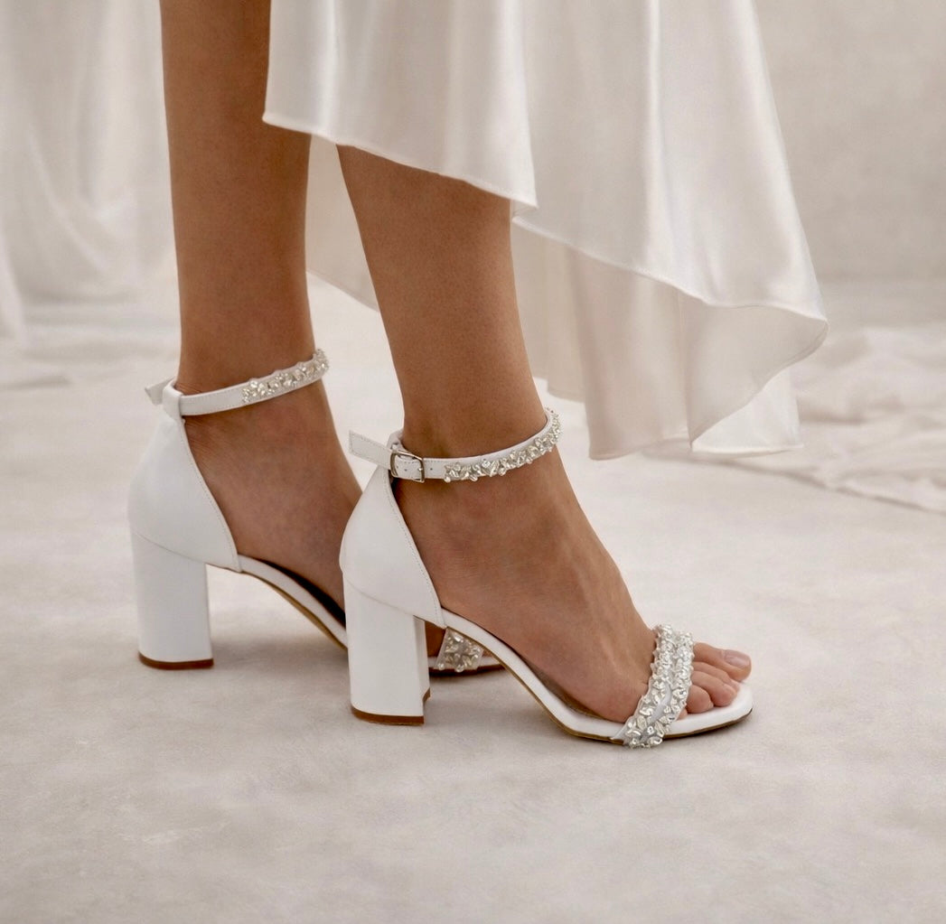Crafted from luxurious white leather, our ''Galaxy'' wedding sandals are adorned with gorgeous dazzling crystals.