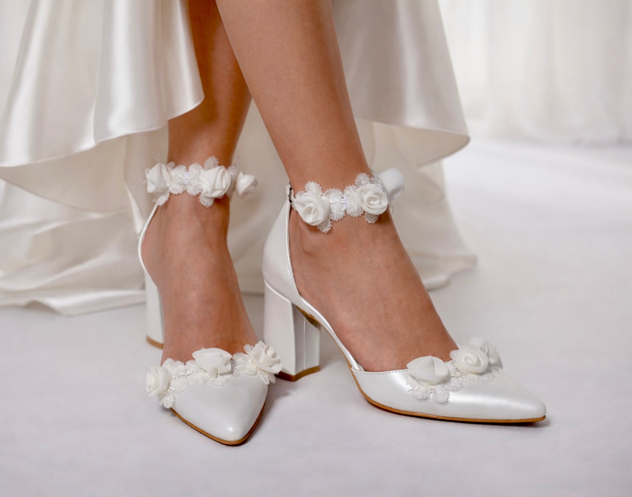 A romantic pair, made by the finest pearly leather, adorned with a beautiful white French flower lace.
