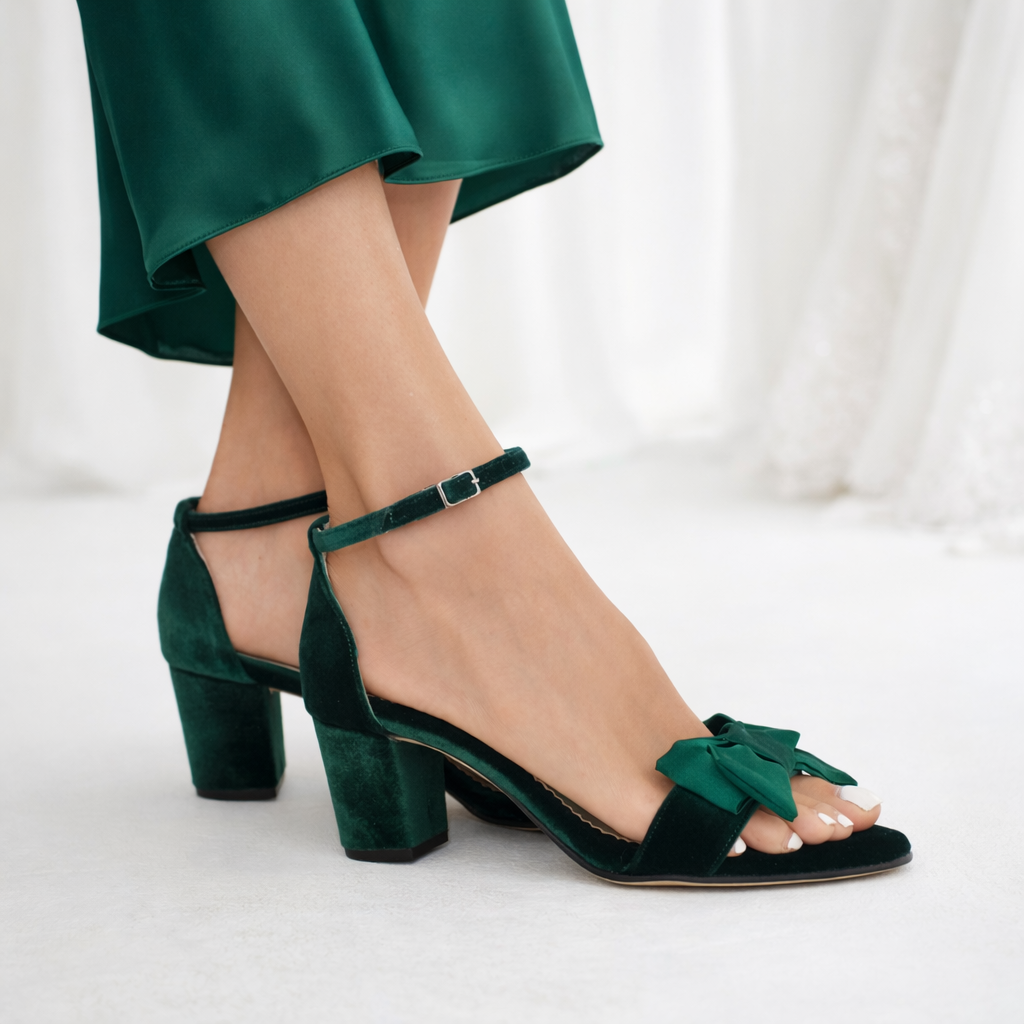 They are handcrafted by premium dark green velvet and leather innersoles, featuring an ankle strap and are finished with chic and comfortable block heels. The ankle strap ensures secure fitting and the excellent craftsmanship ensures comfort for an all day wear.