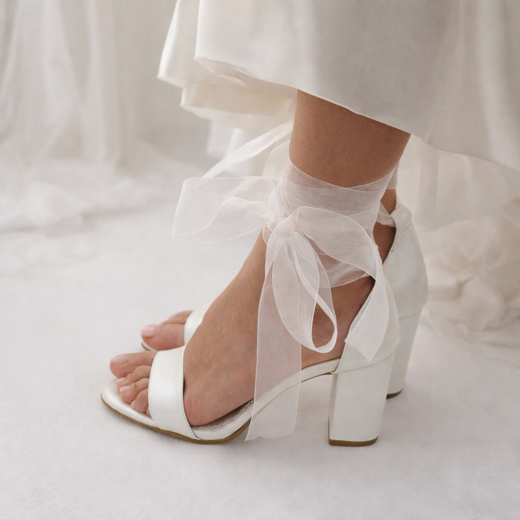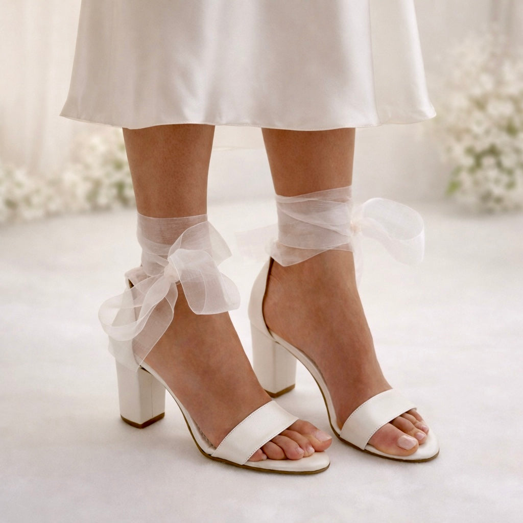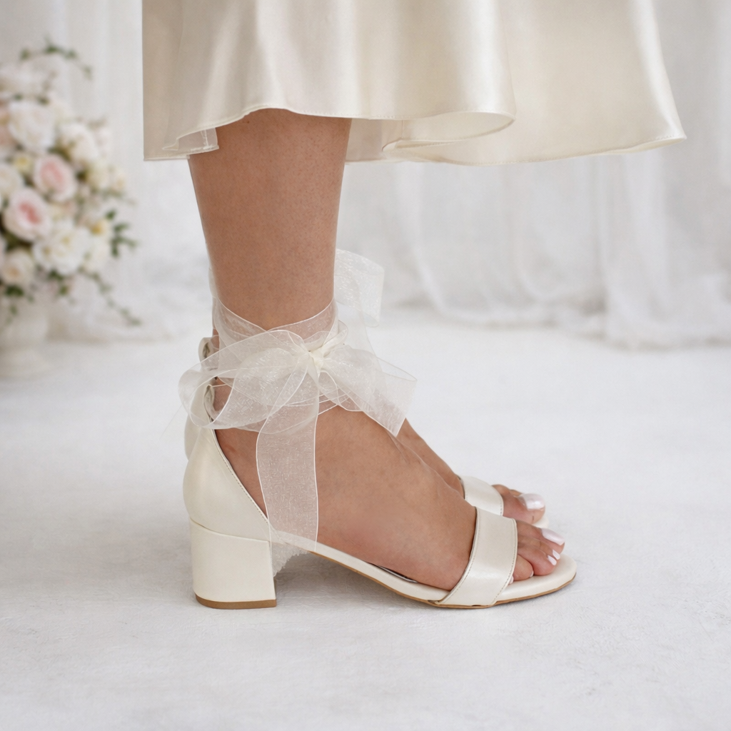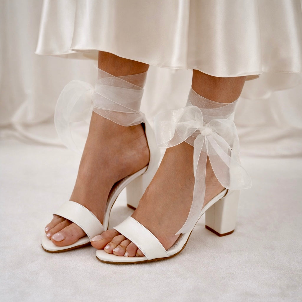 A stunning pair of ivory heeled leather sandals, our ''ANGEL'' sandals are handcrafted from premium pearlized ivory leather, featuring flattering organza laces, lightly padded foot bed for extra comfort, and are finished with a chic block heel.