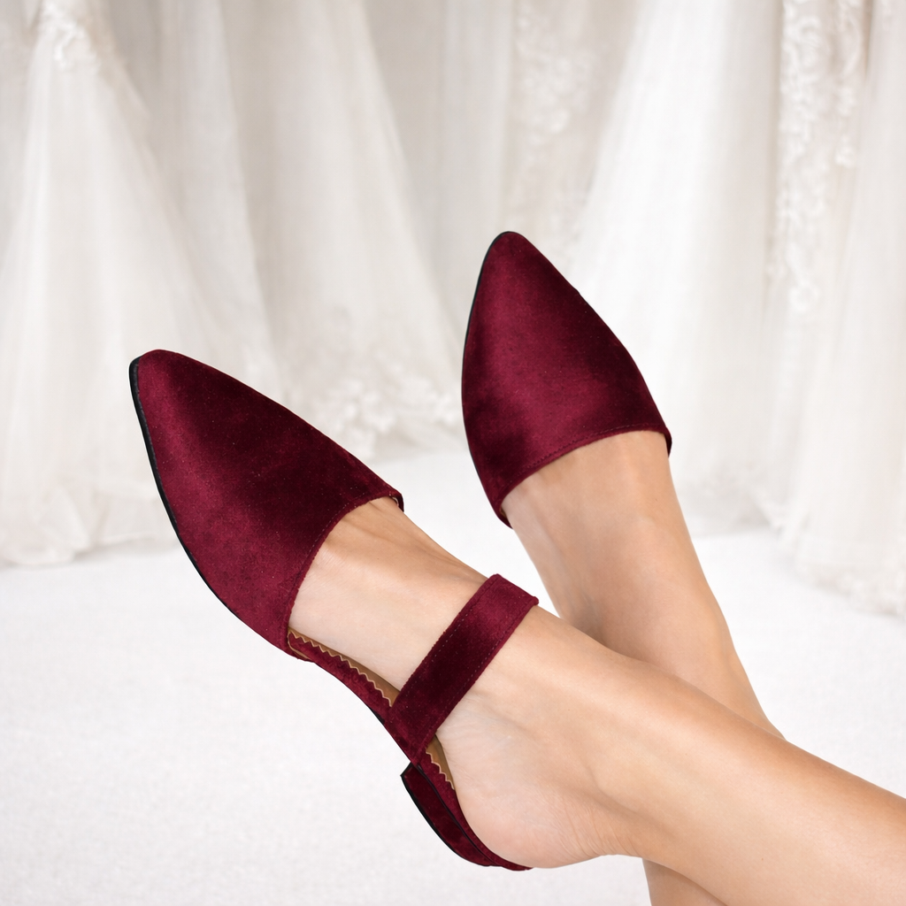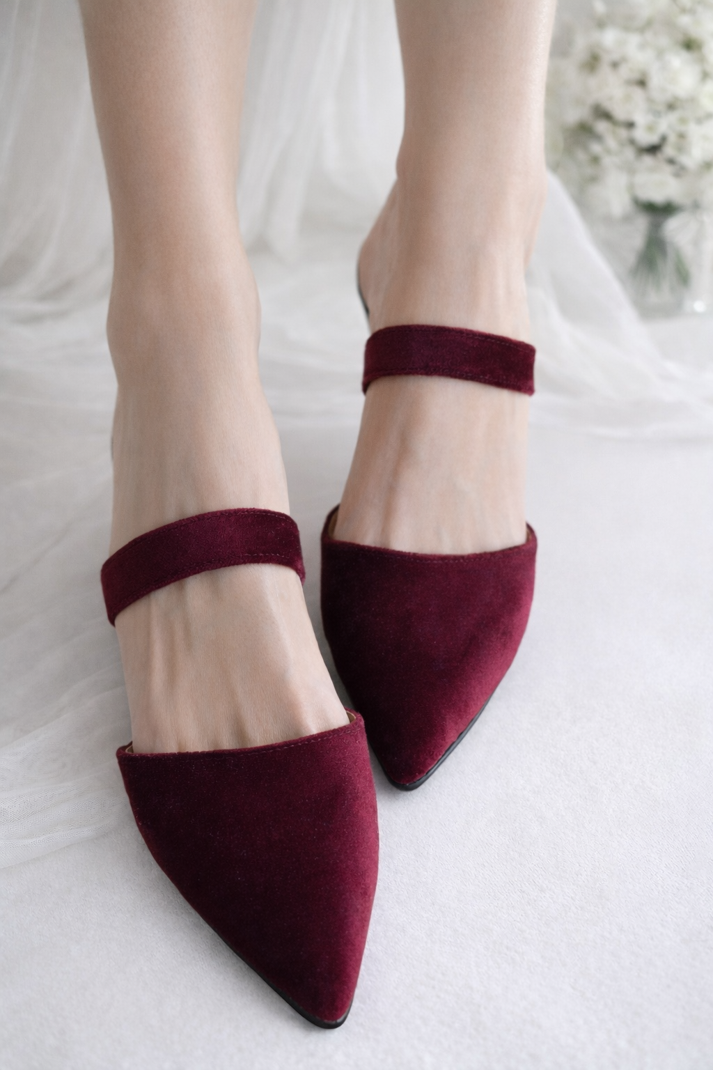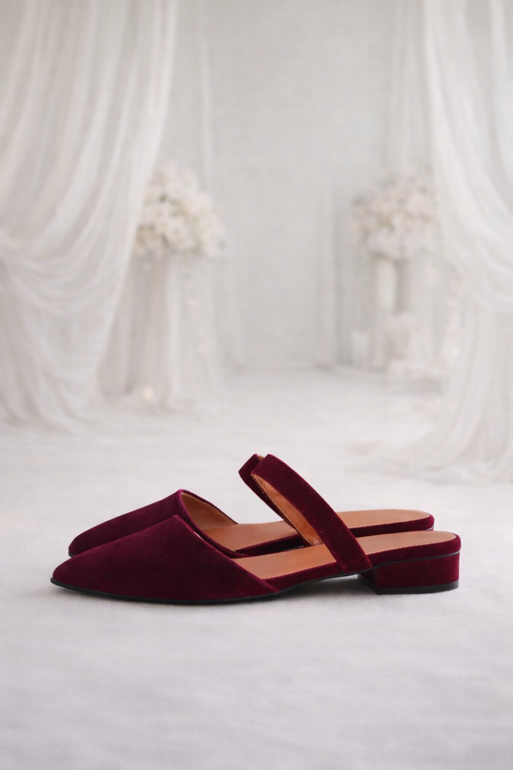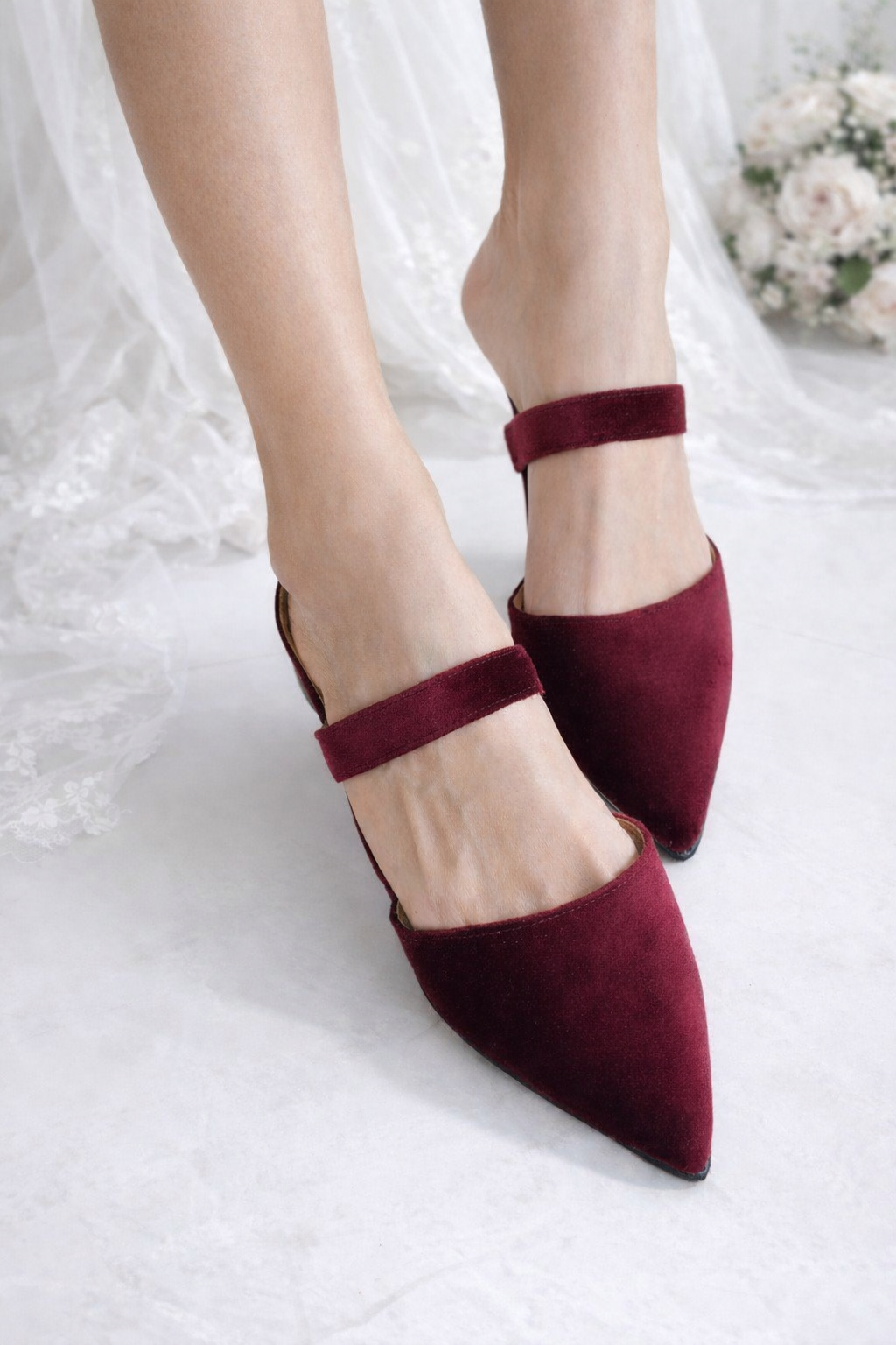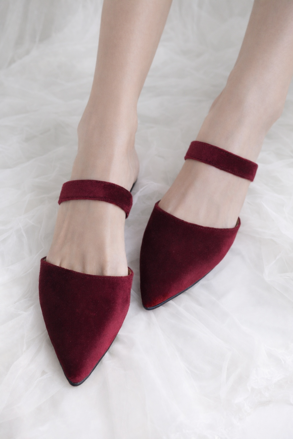 Our ''Valery'' pointed toe mules are made of genuine leather with a lightly cushioned sole, and lush wine red velvet.