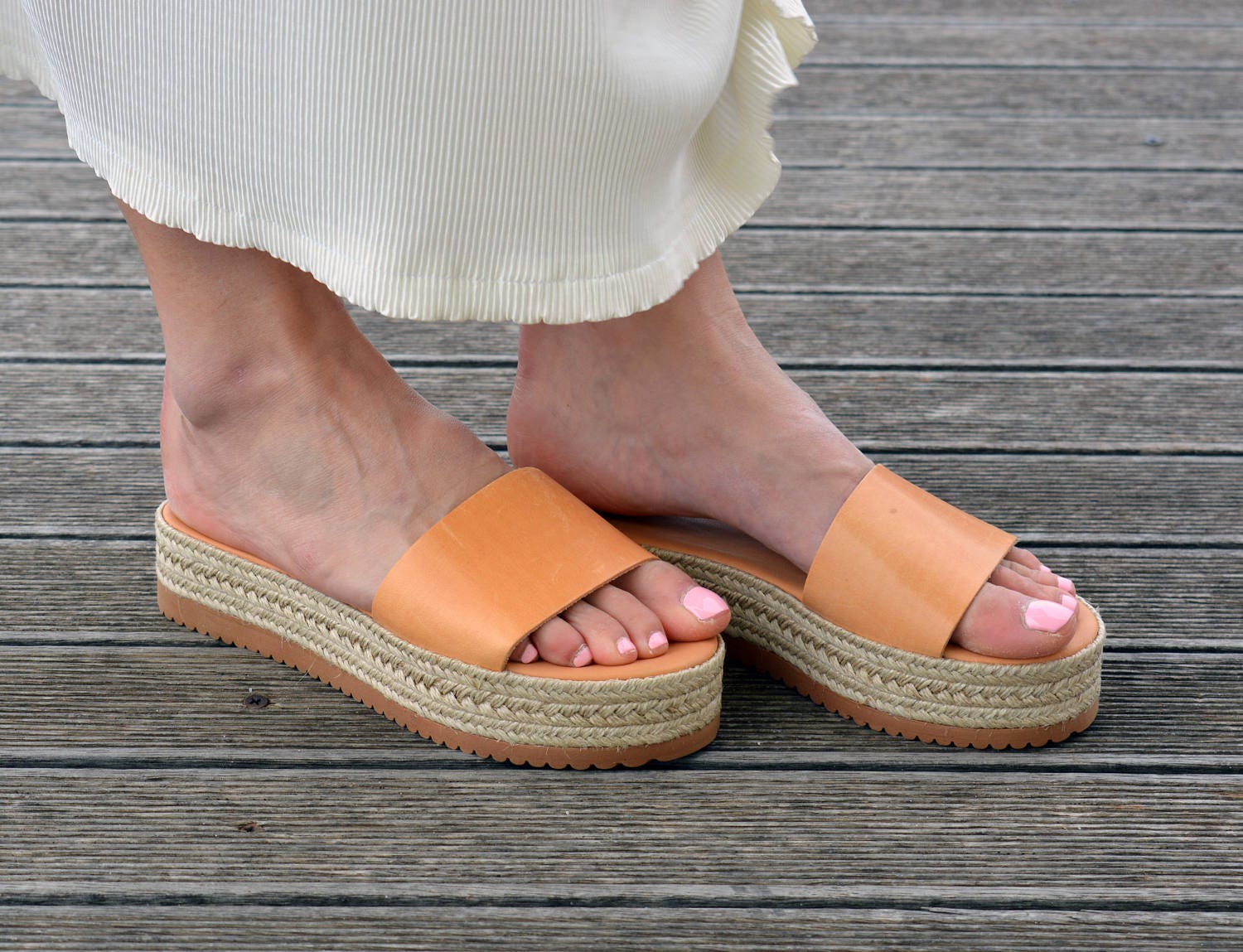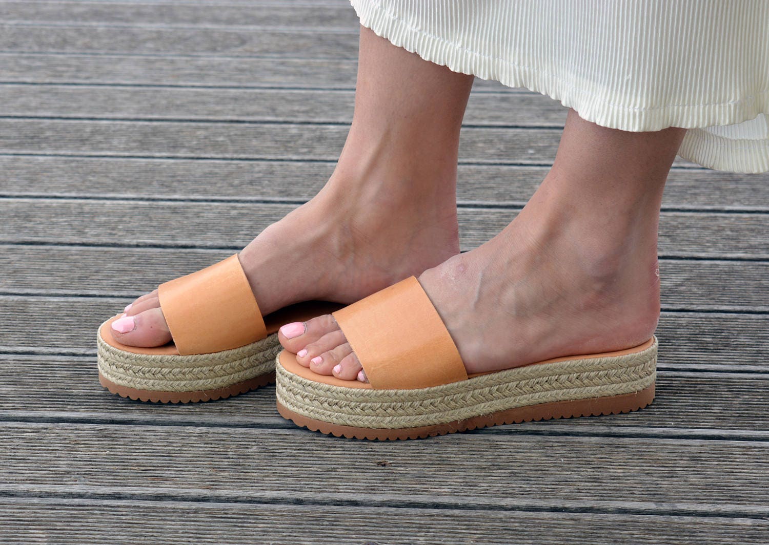 ♥ Made by genuine leather. Cushioned leather footbed on the upper sole. The platform measures 4 cm. Platform features braided jute ropes and rubber anti skid soles.