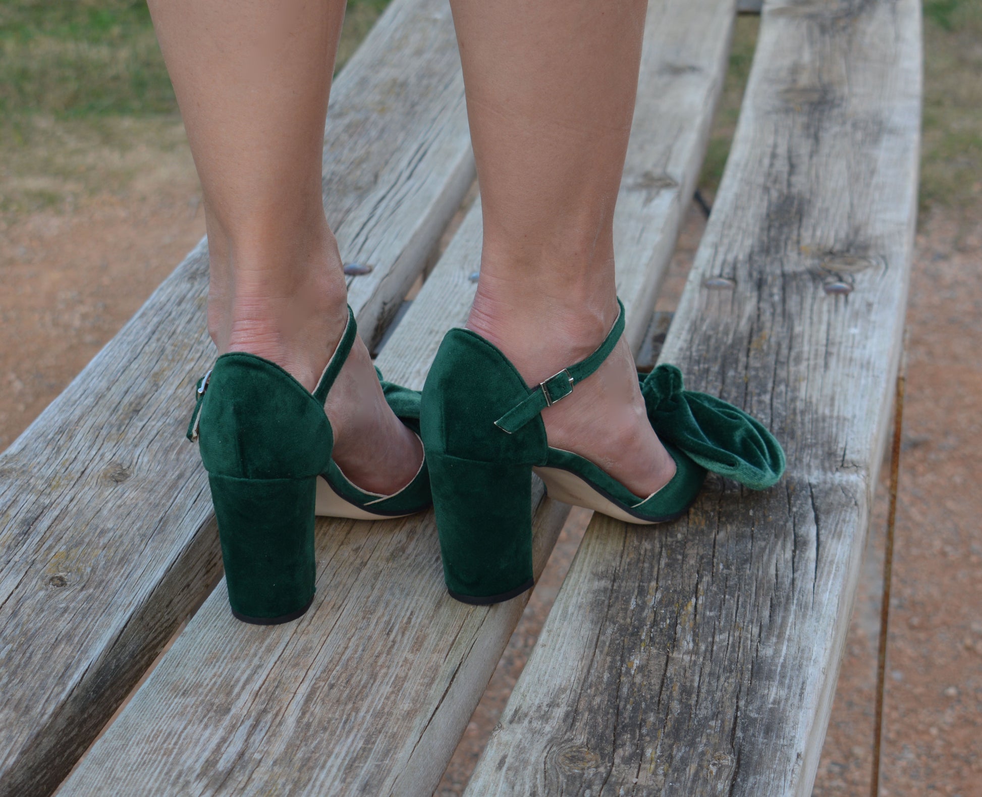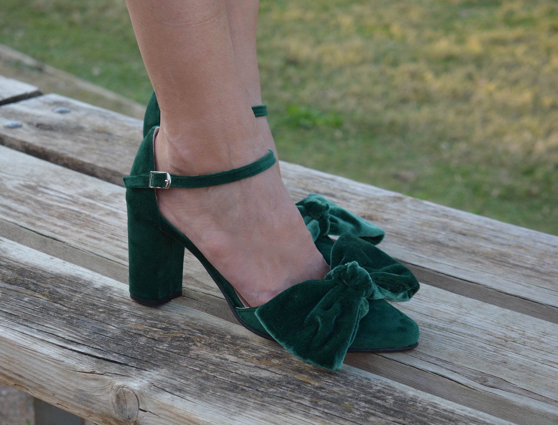 They are handcrafted by premium green velvet and leather innersoles, featuring an ankle strap and are finished with chic and comfortable block heels. The ankle strap ensures secure fitting and the excellent craftsmanship ensures comfort for an all day wear.