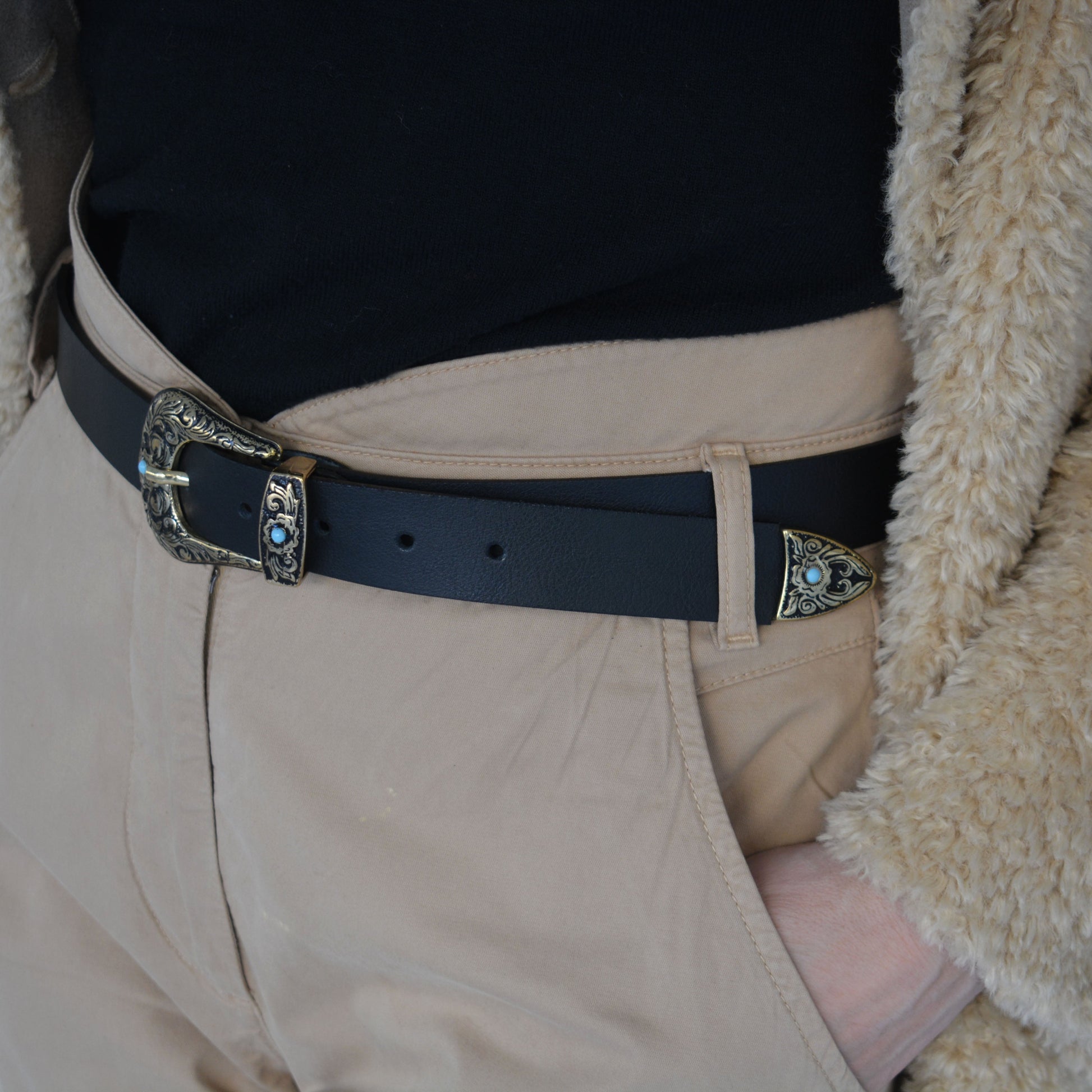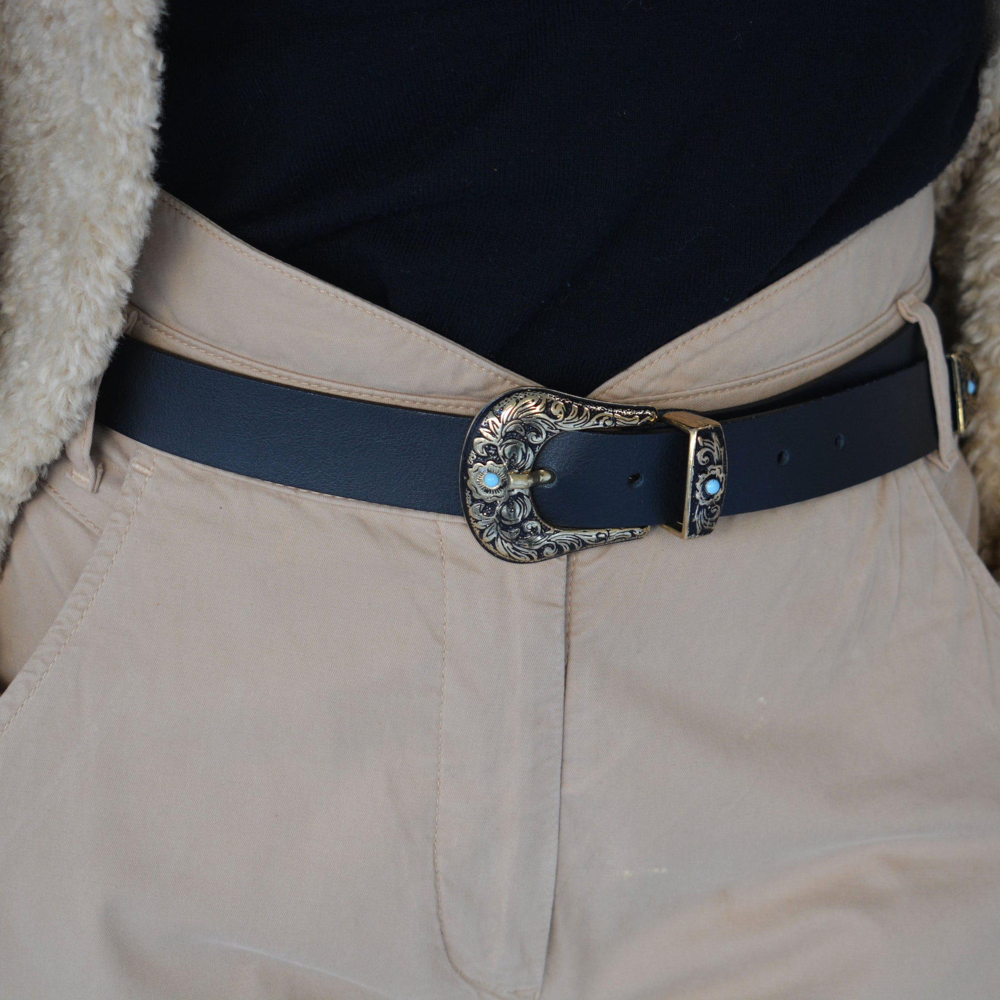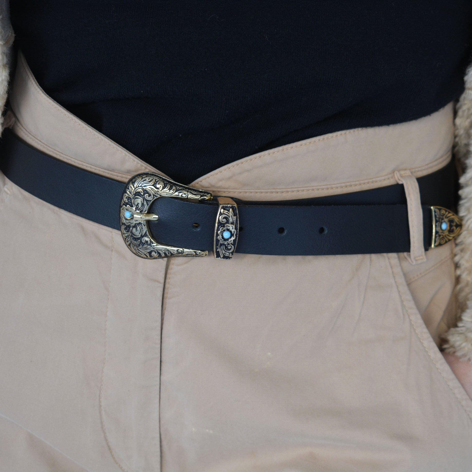 SHASHA belt. Made from genuine Greek leather, this chic belt is defined by refined details. The slim and feminine silhouette is adorned with a gold & black tone buckle, and turquoise stones.