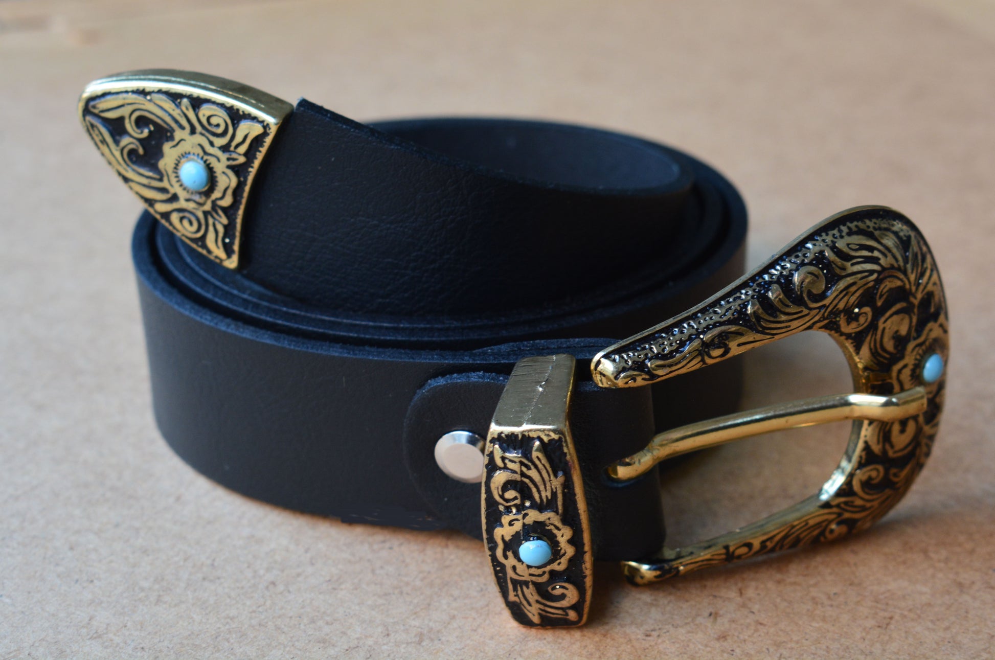 Gold metal buckle with turquoise stones
