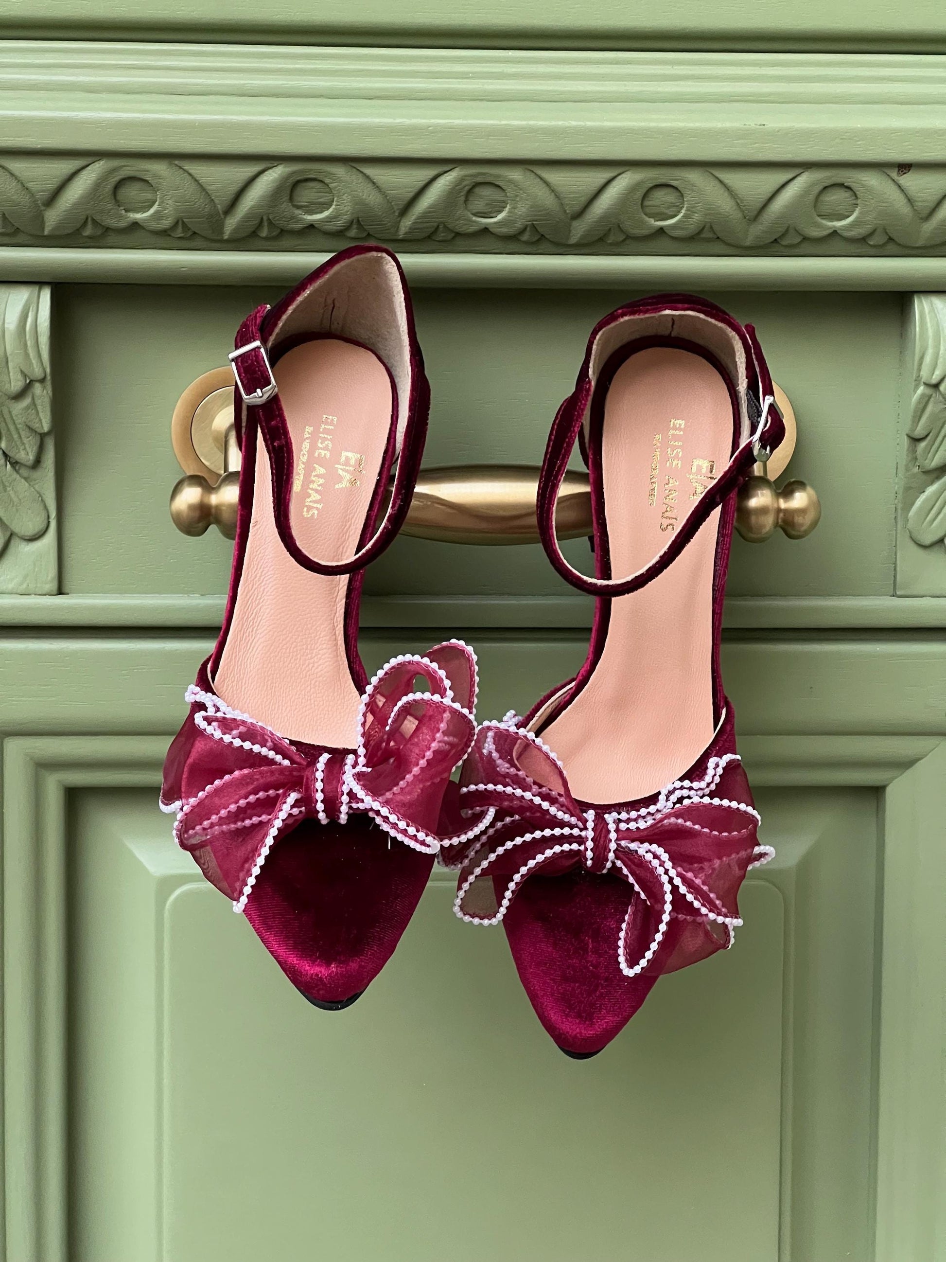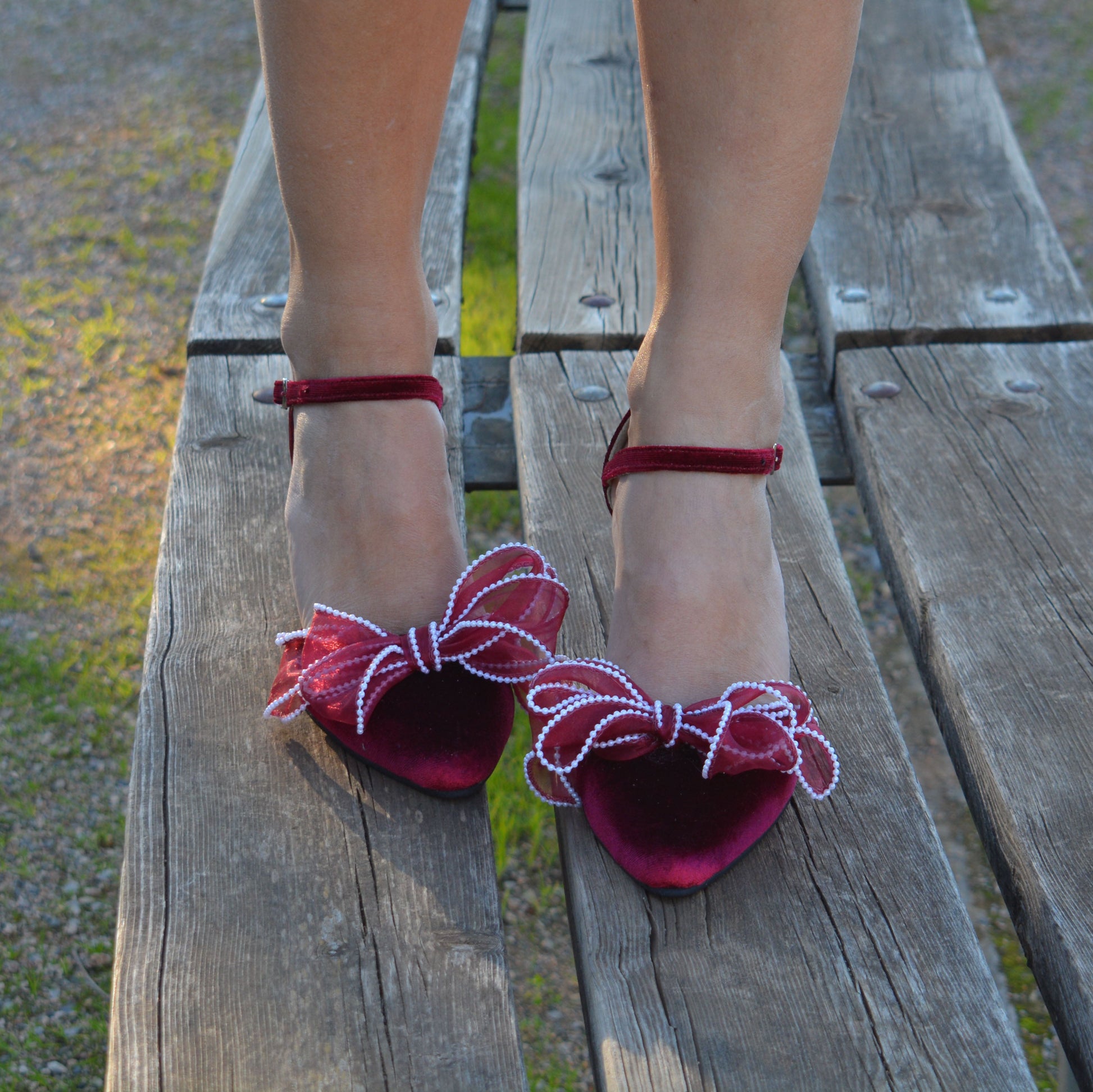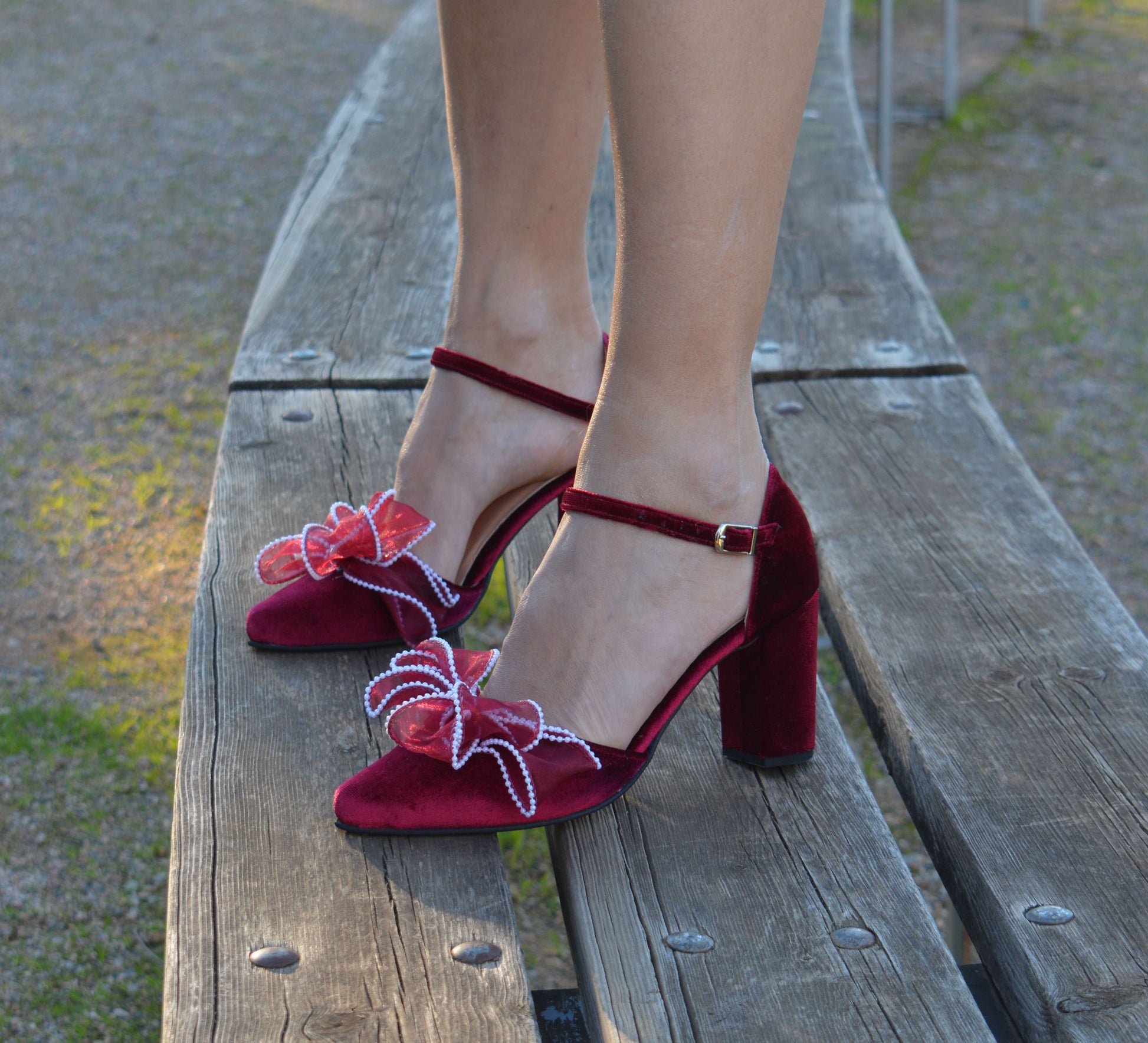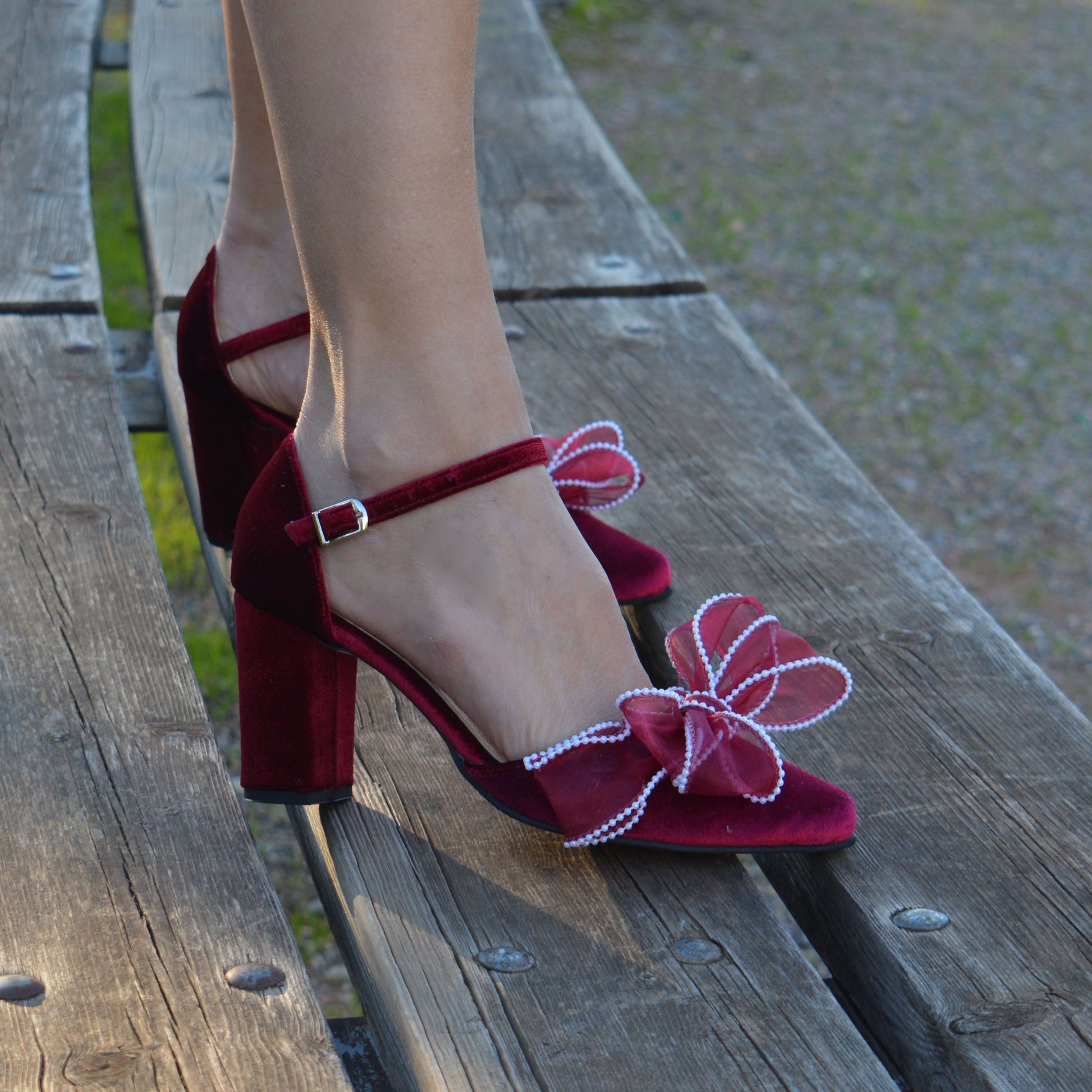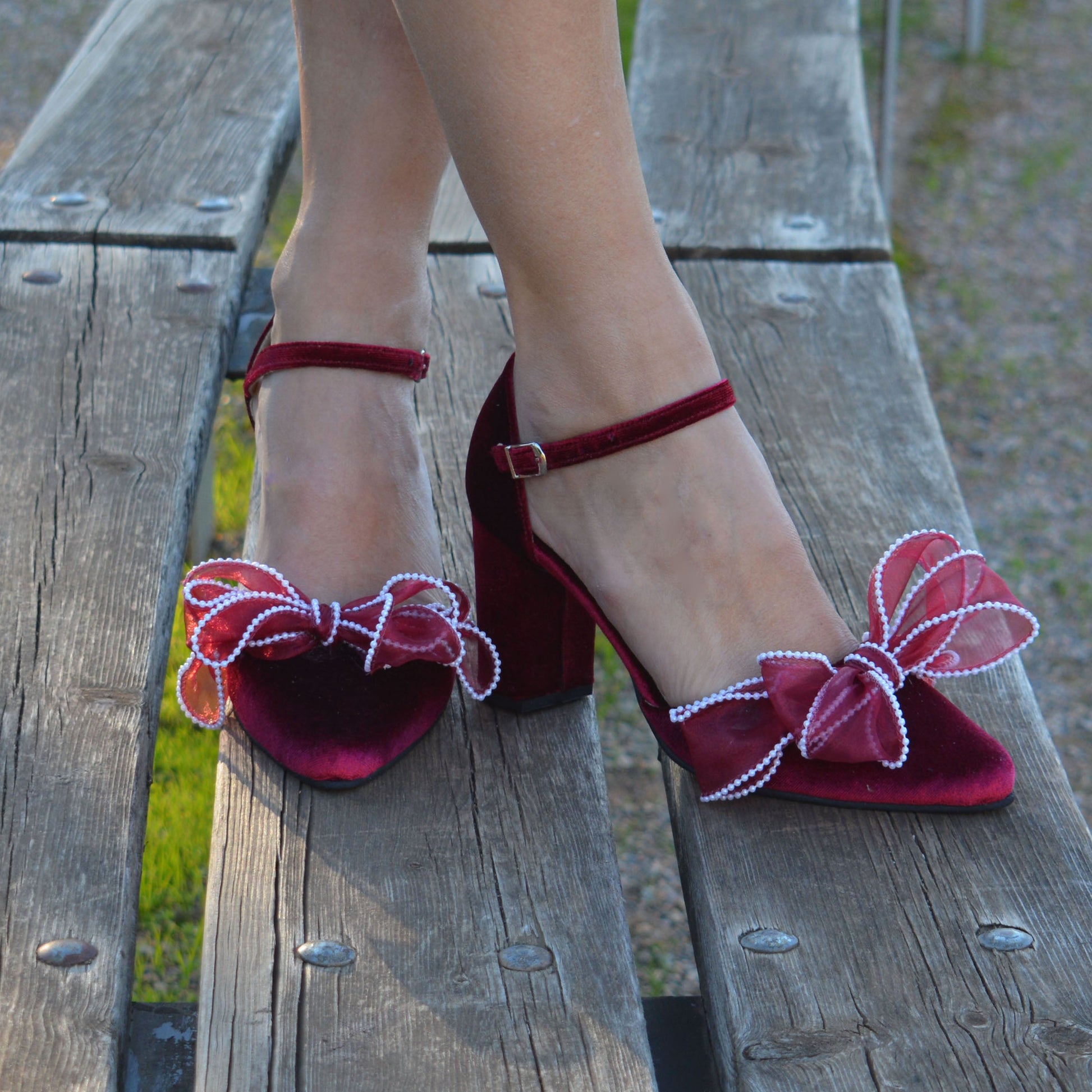 Our dark red Bow heel 'Valentina' is handcrafted by premium dark red velvet and leather lining, featuring an ankle strap and are finished with chic and comfortable block heels. Decorated with fabulous handmade Organza bows with pearls.