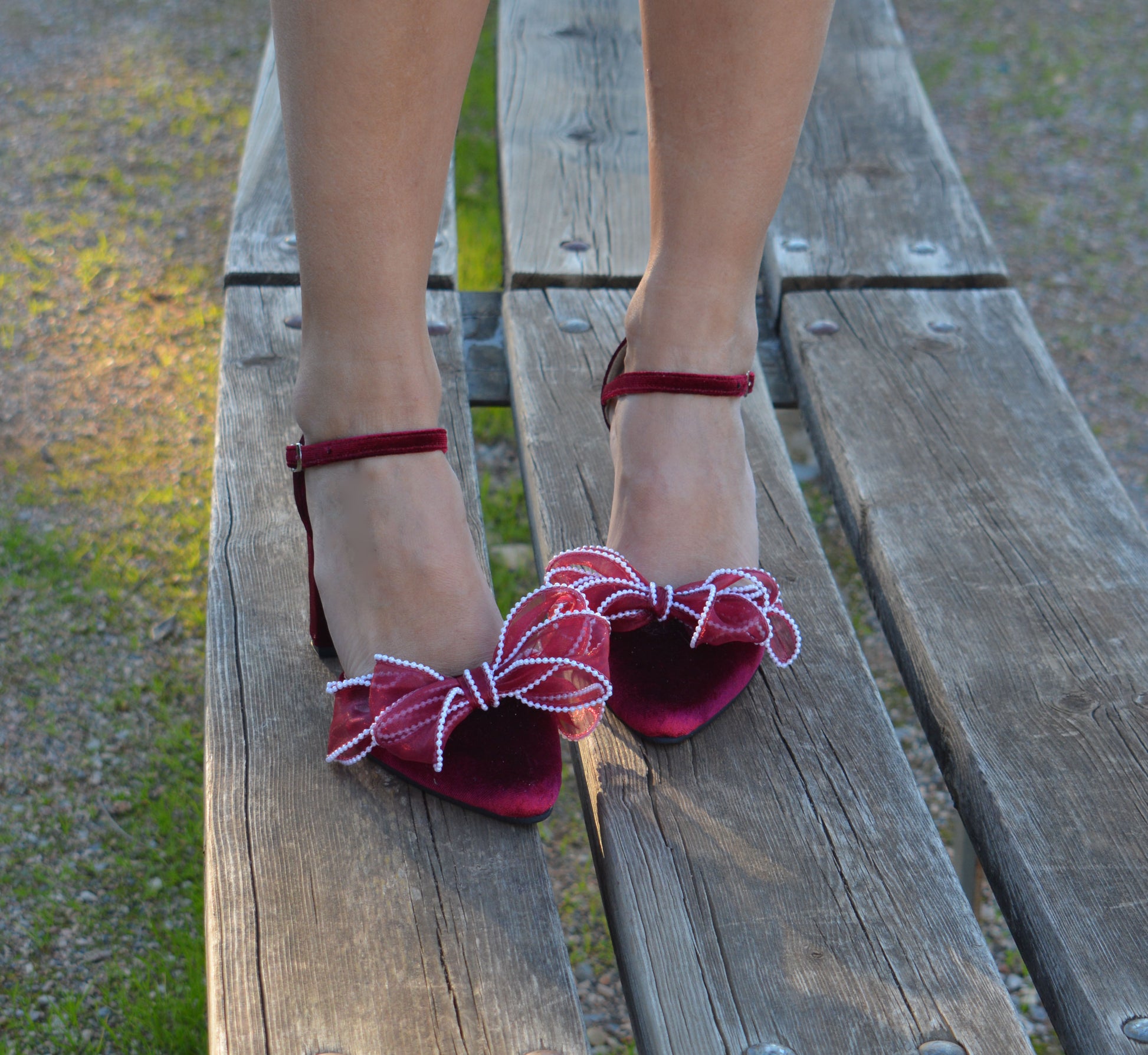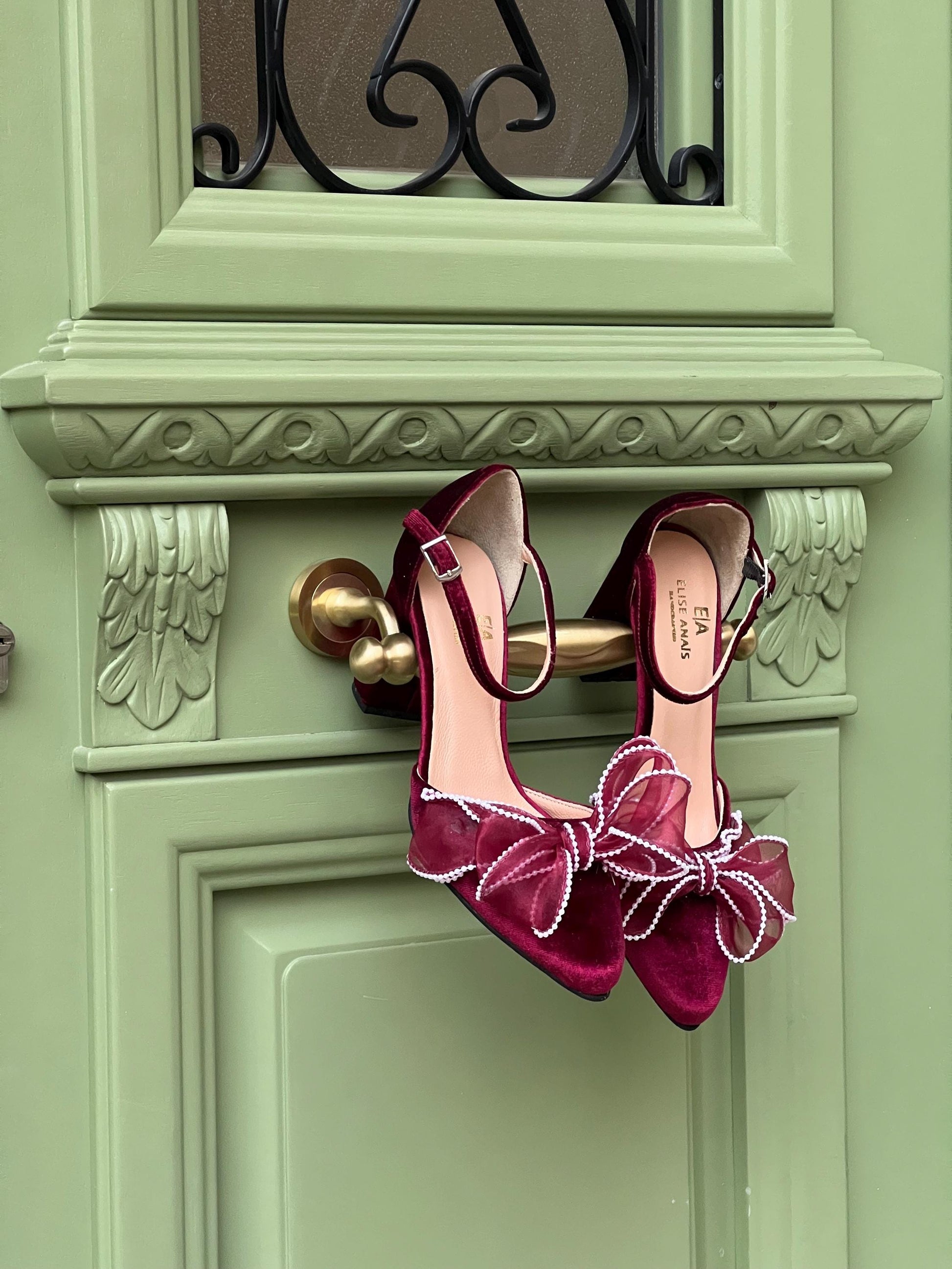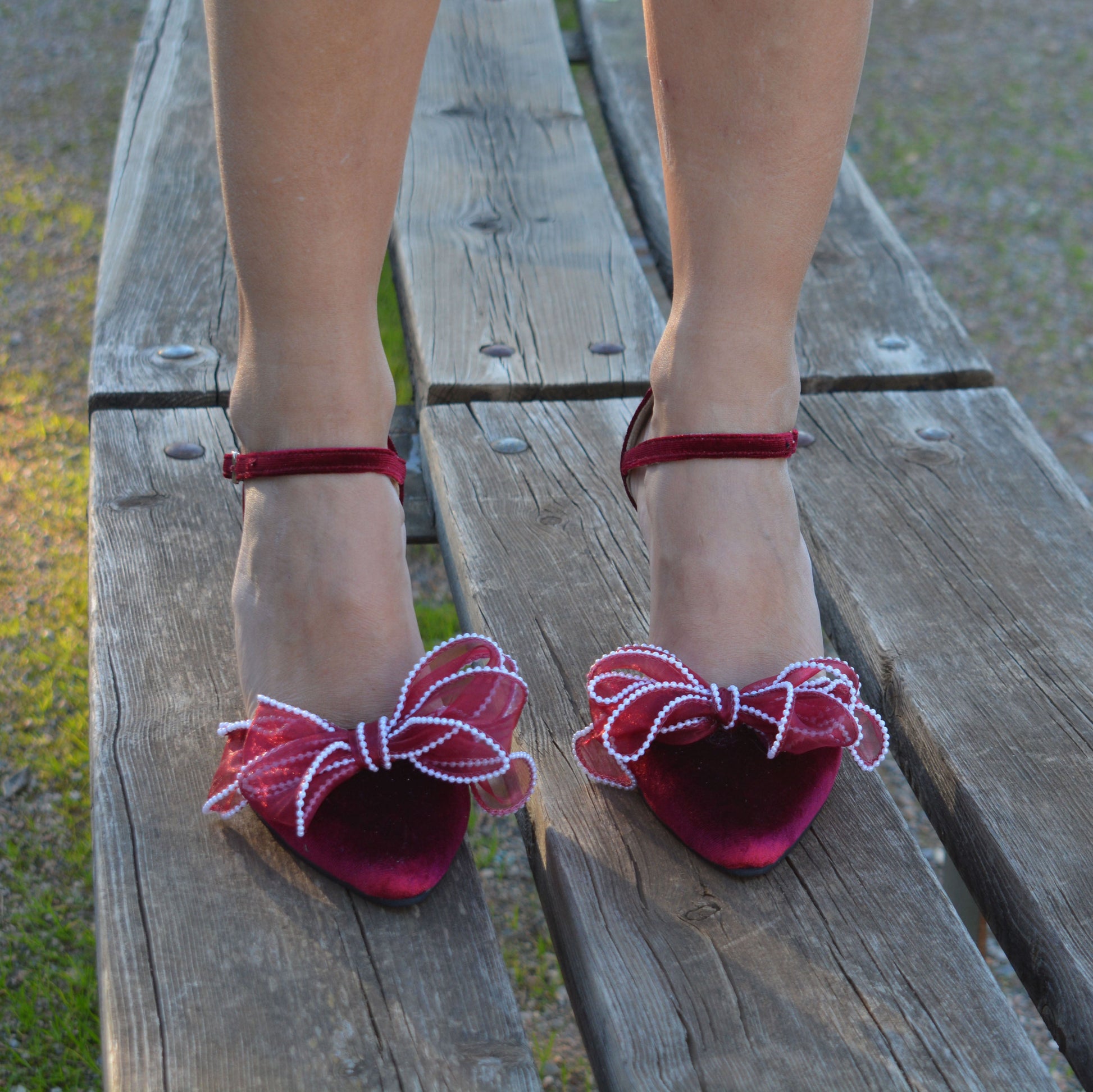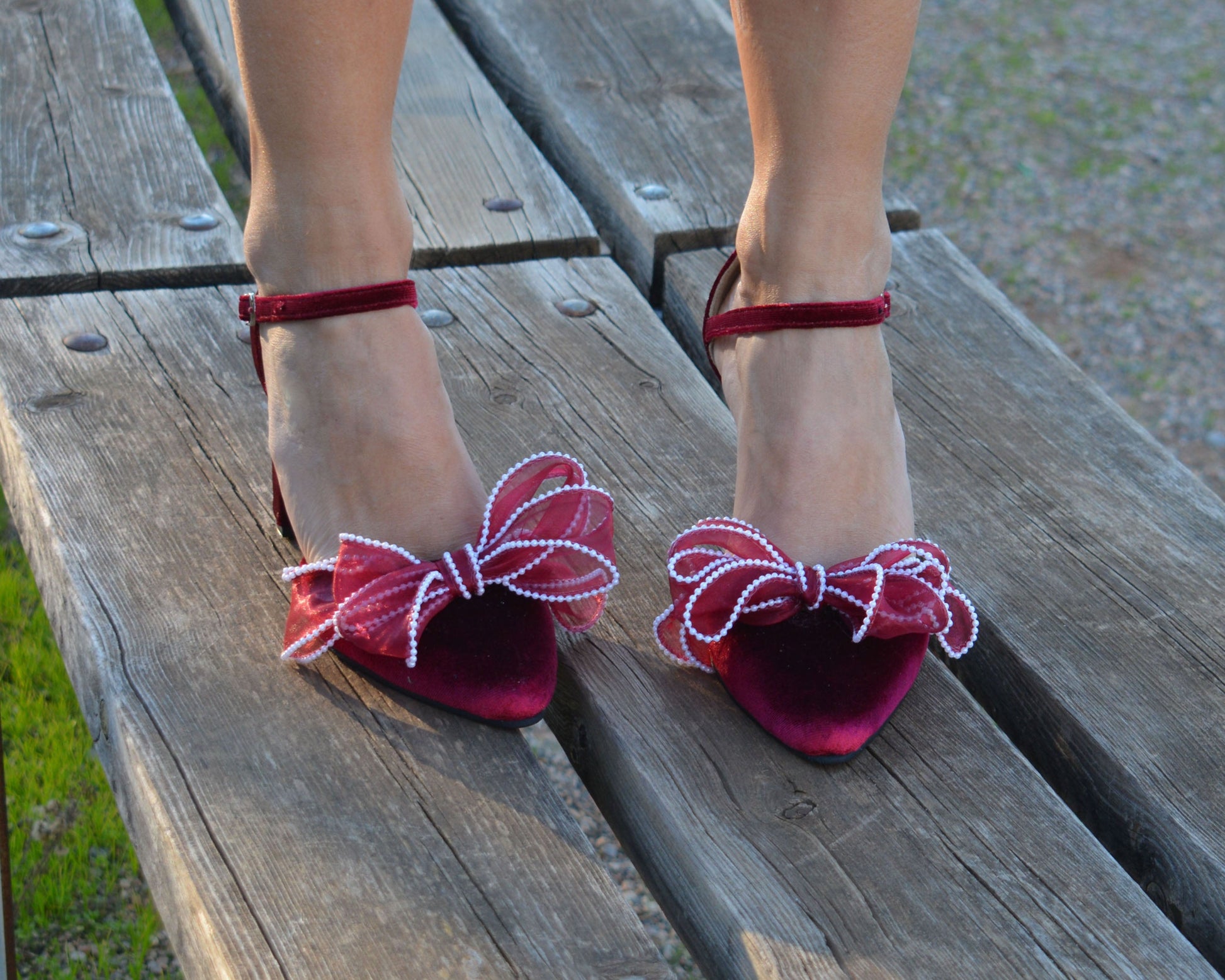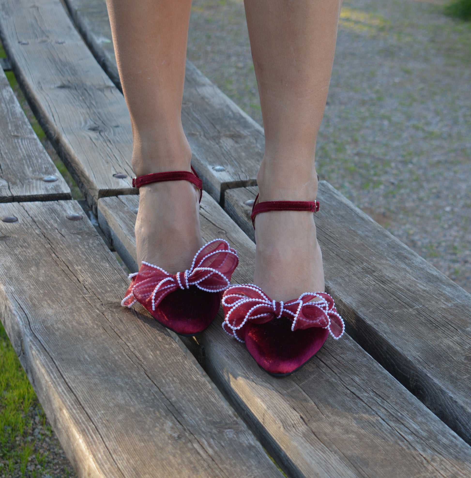 Our dark red Bow heel 'Valentina' is handcrafted by premium dark red velvet and leather lining, featuring an ankle strap and are finished with chic and comfortable block heels. Decorated with fabulous handmade Organza bows with pearls.