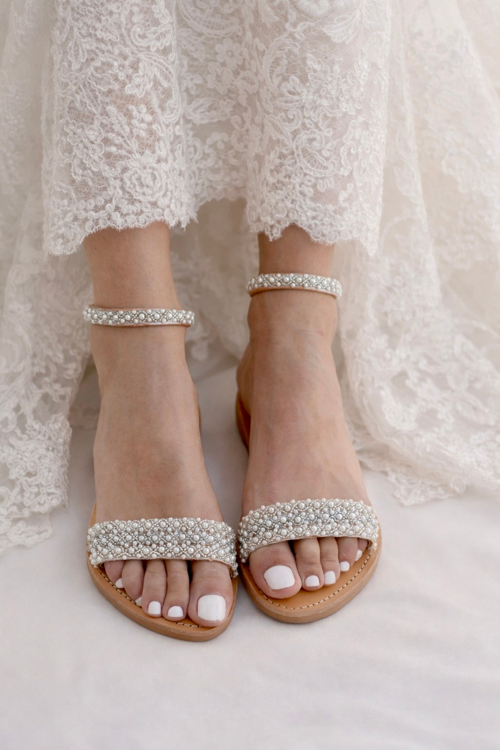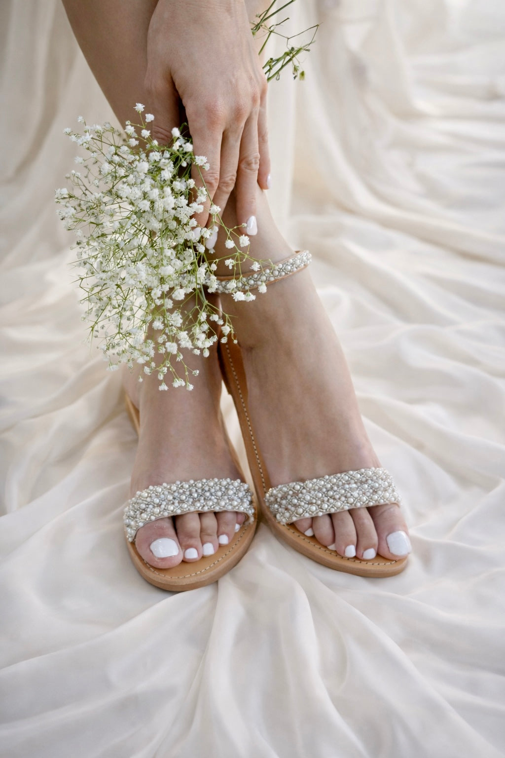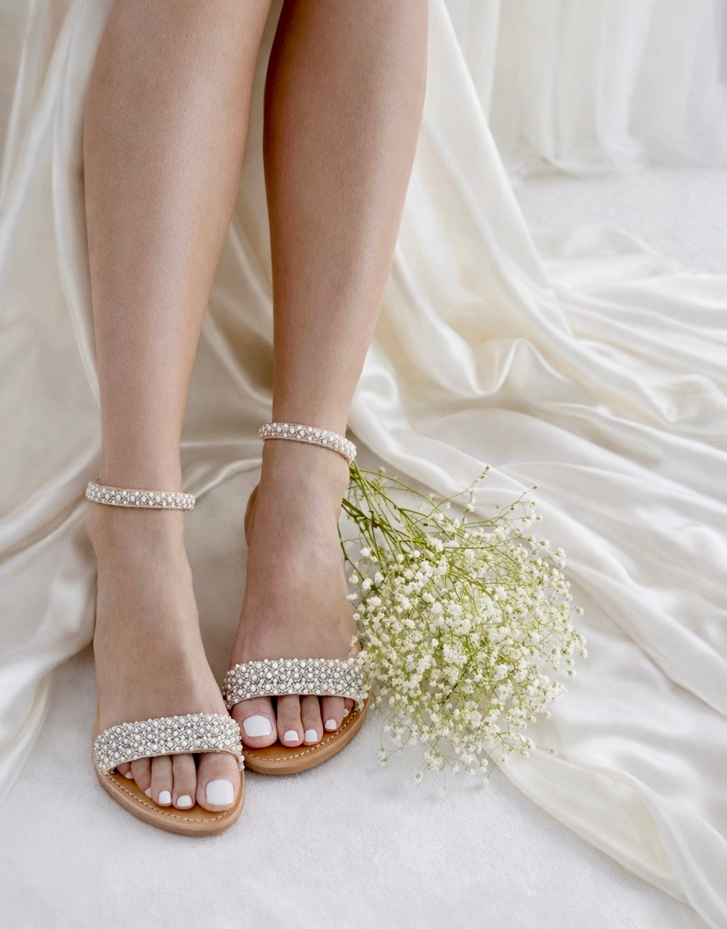 Our stunning leather sandals 'Elsa'. Hand decorated with a beautiful trim of glossy pearls and silver seed beads. They compliment the foot offering an elegant and delicate look.
