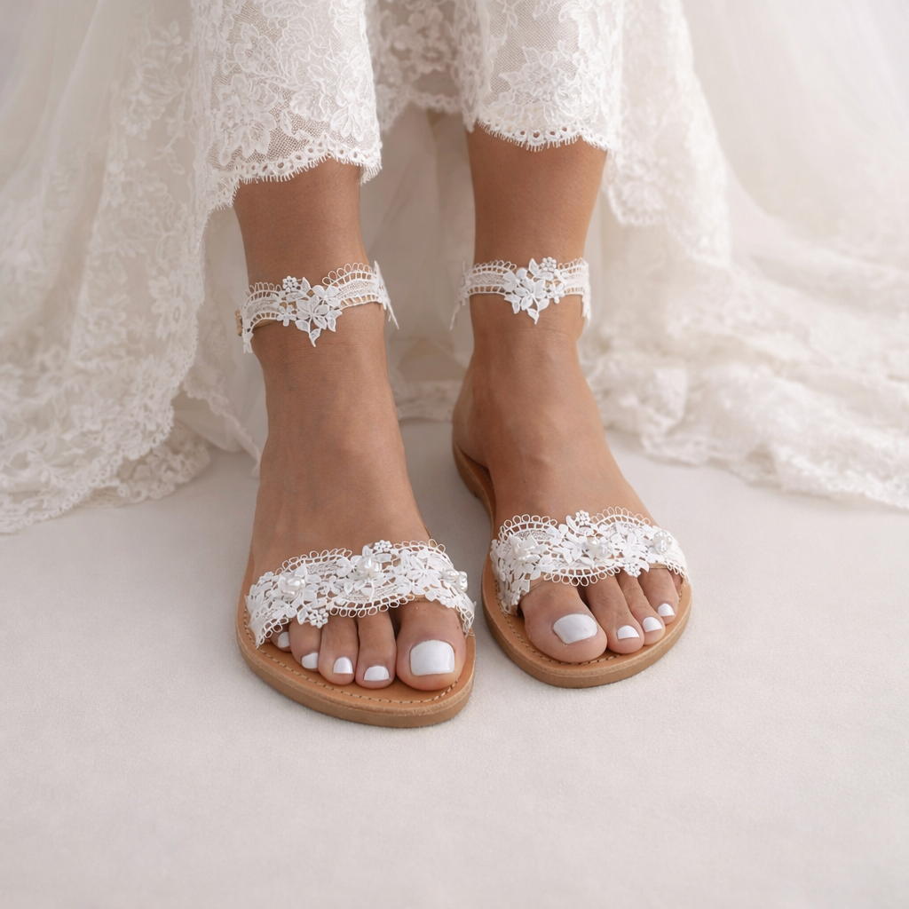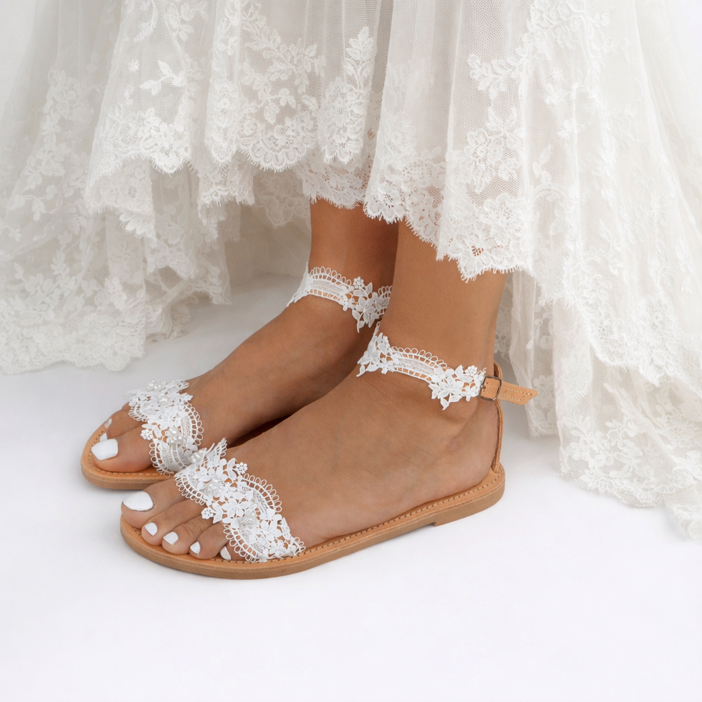 Our romantic leather sandals 'Cherish'. Hand decorated with a beautiful lace and hand stitched glossy pearls. They compliment the foot offering an elegant and delicate look.