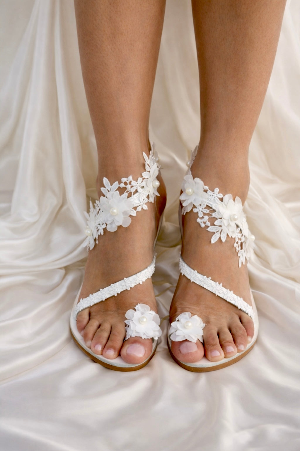 ''DIVINE''. A heavenly pair, made by the finest white leather, adorned with a beautiful white French crochet lace, that surrounds your ankles like a dream!