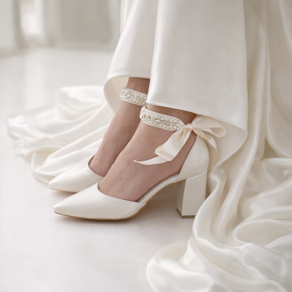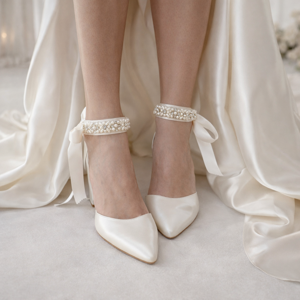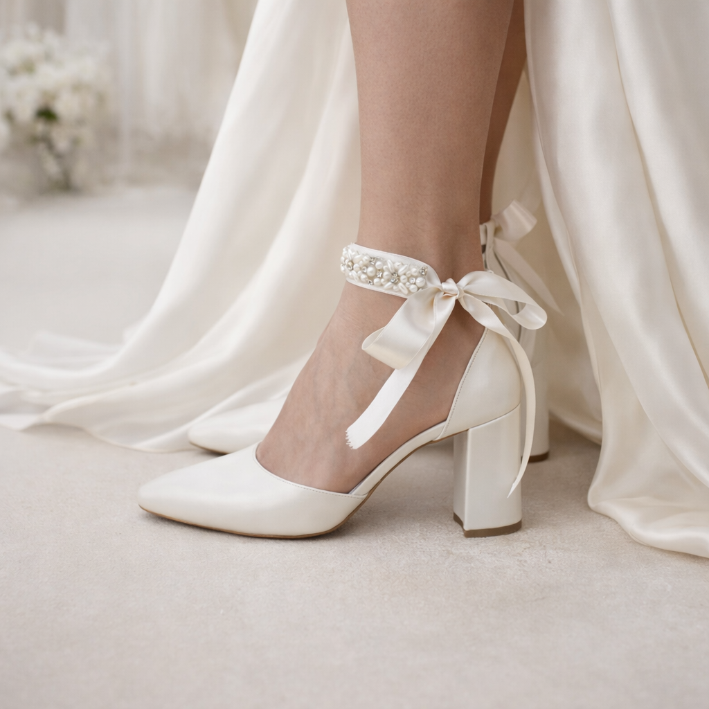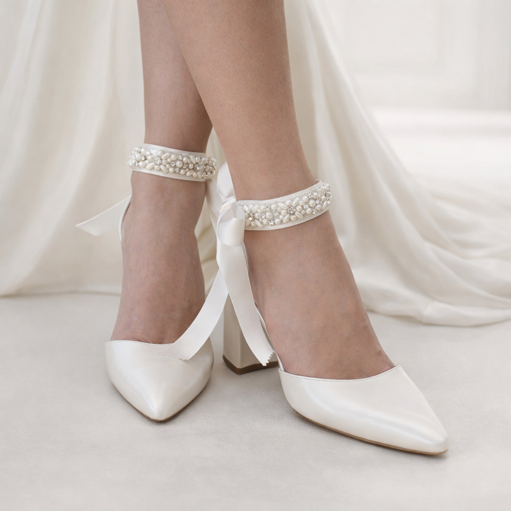 A stunning pair of ivory heeled leather block heels, our ''Ariadni'' heels are handcrafted from premium pearlized ivory leather, featuring flattering satin pearl laces, lightly padded foot bed for extra comfort, and are finished with a chic block heel.