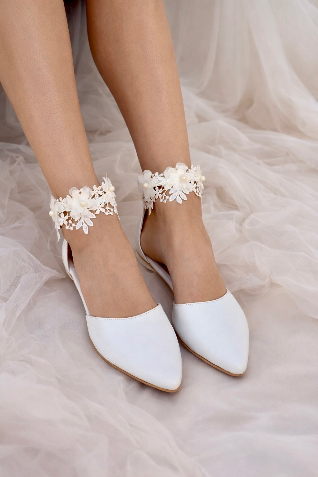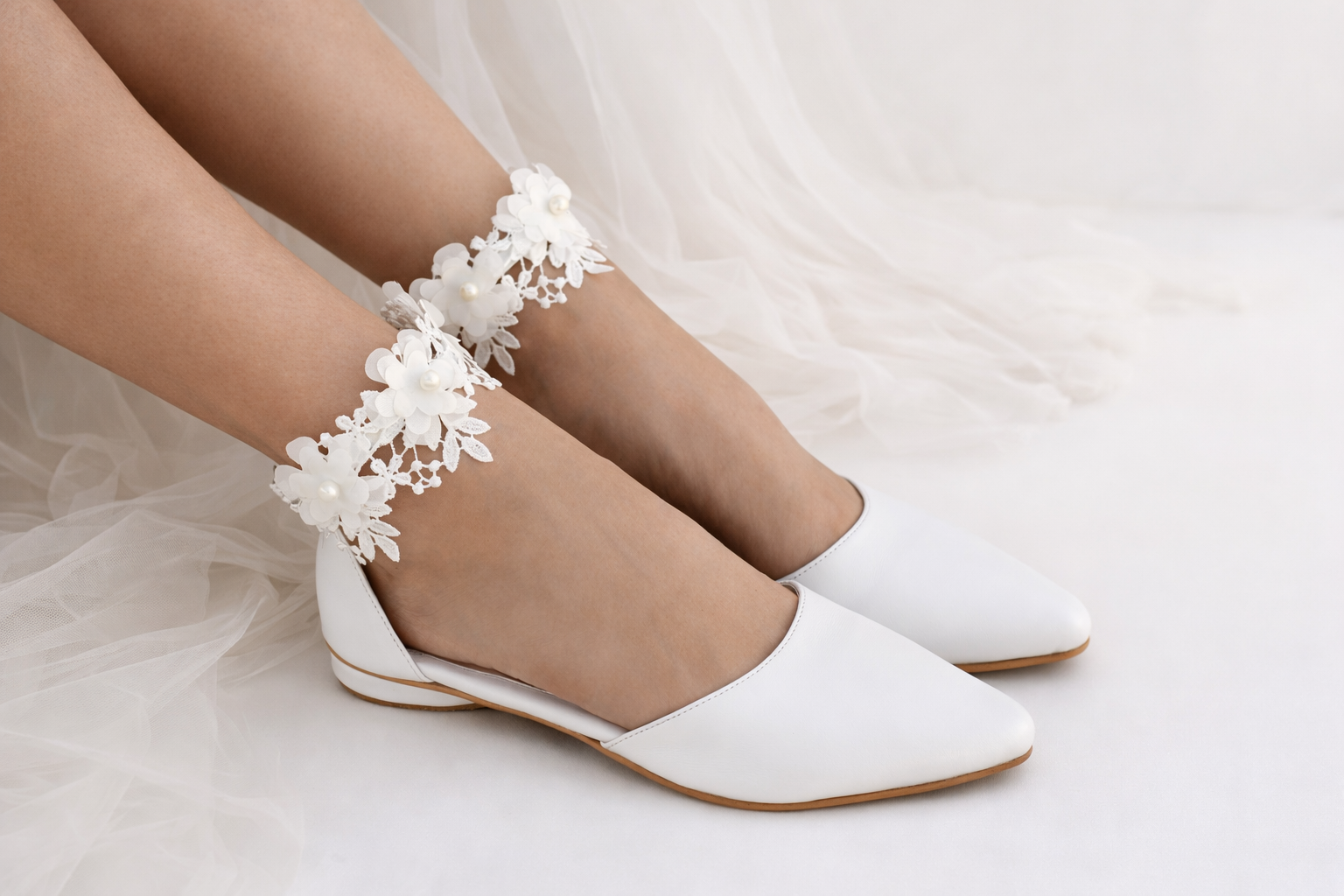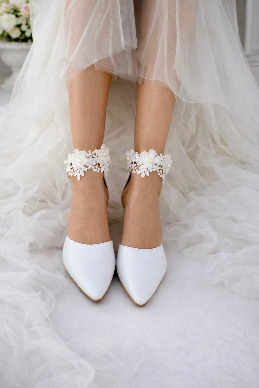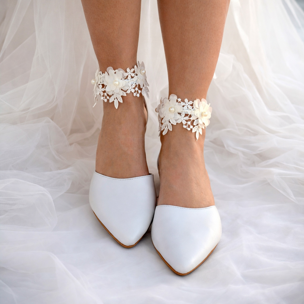 ''EMILY''. A romantic pair, made by the finest leather, adorned with a beautiful white French crochet lace.